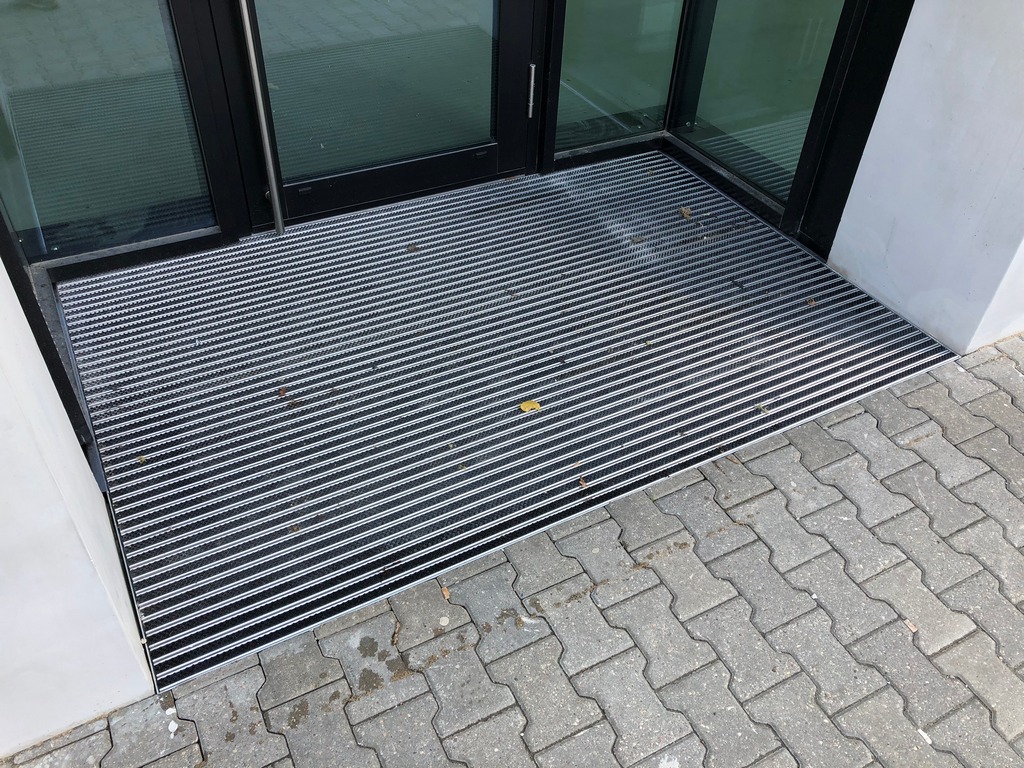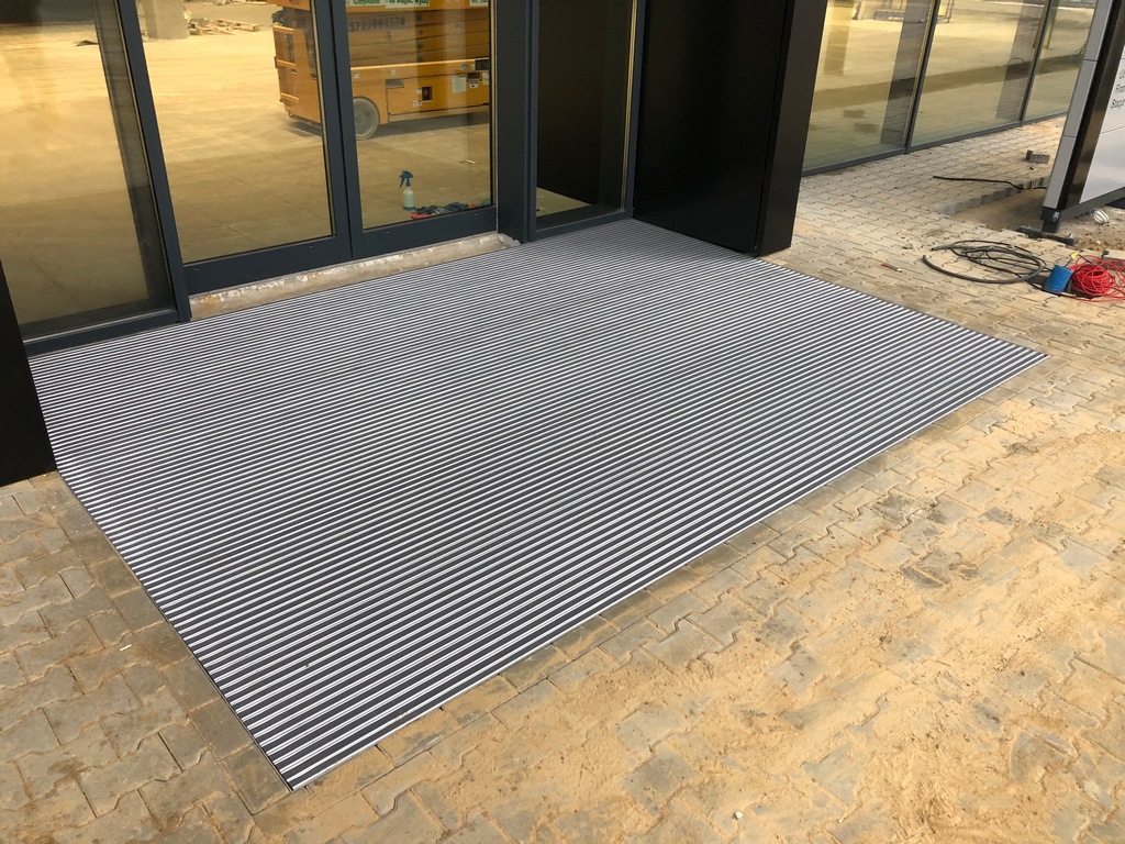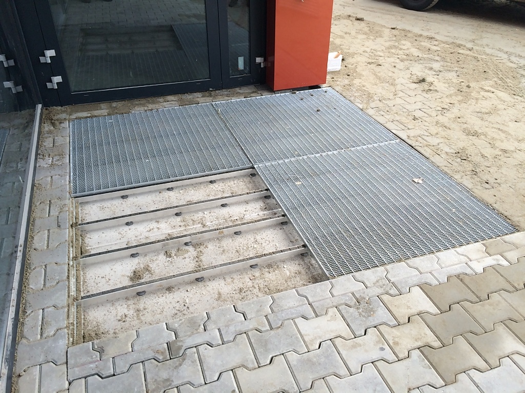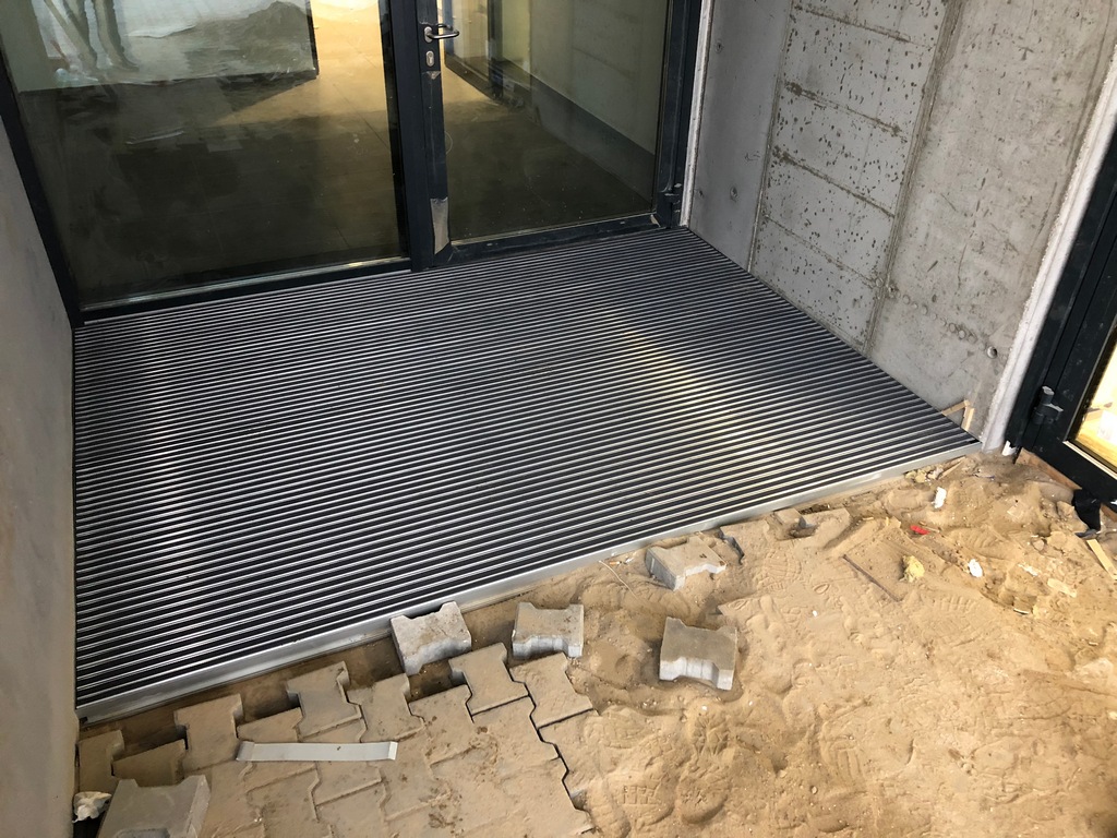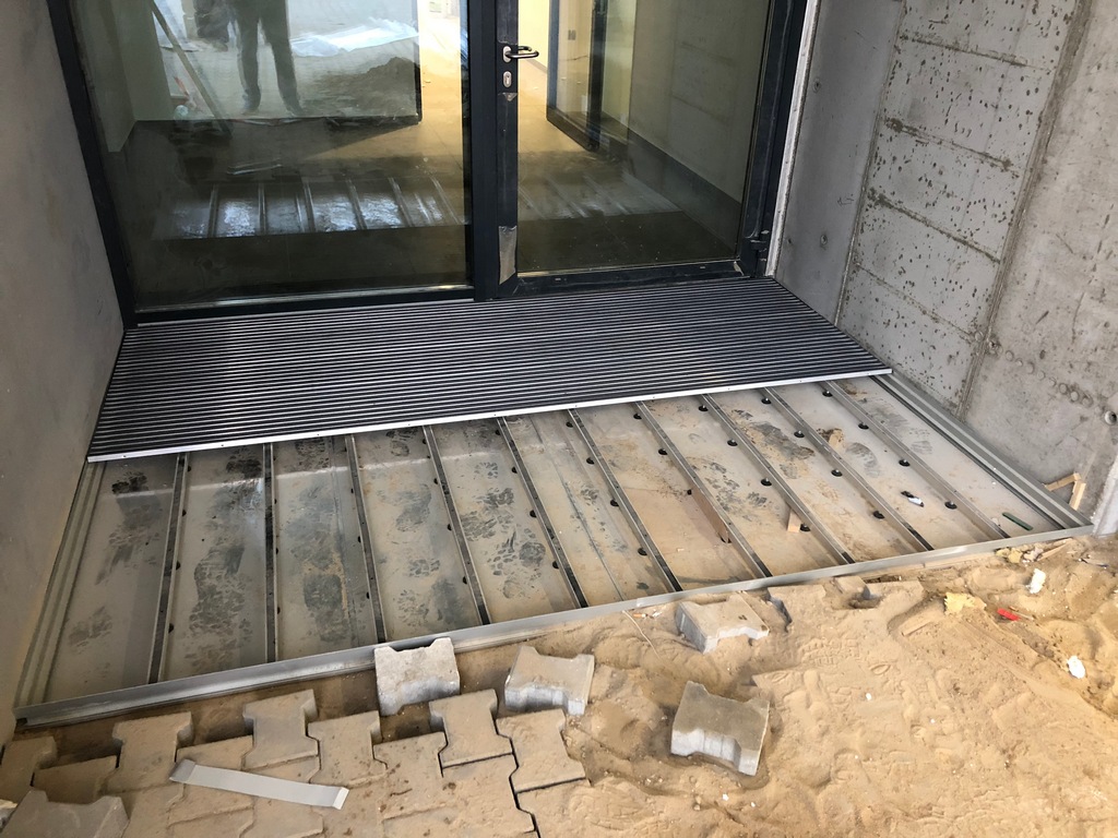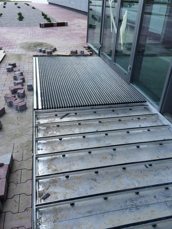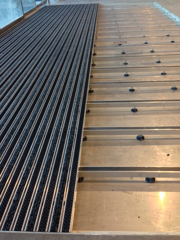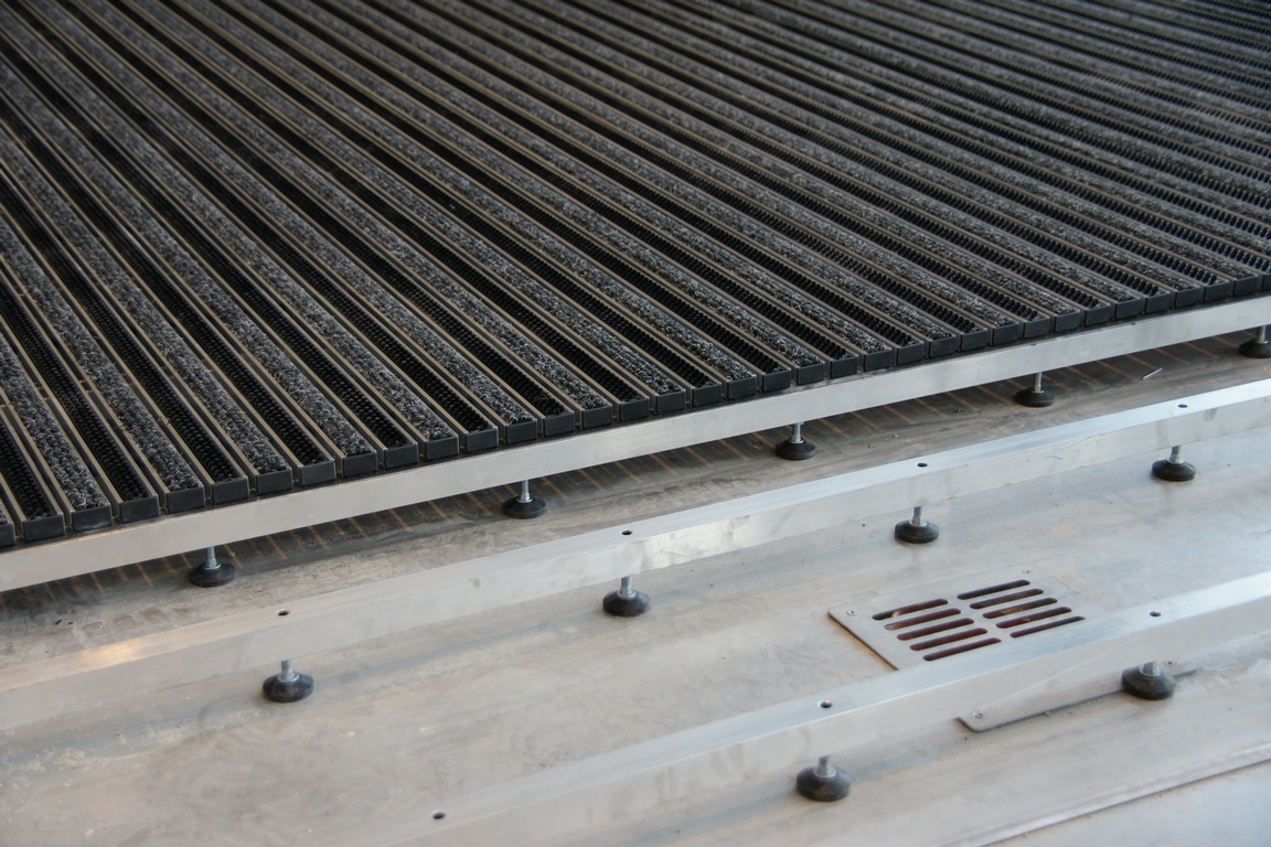 How it works? Professionally designed, anodized aluminum profiles create a frame with a bottom made of aluminium plate. Doormat supports are permamently mounted to the edges of the proflies, spaced approximately every 30 cm (made of square - shaped pipe 30x30x3). Those supporting elements have coasters that provide stability and possibility of leveling.