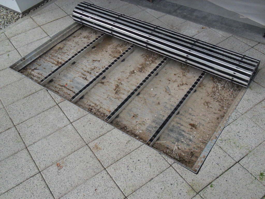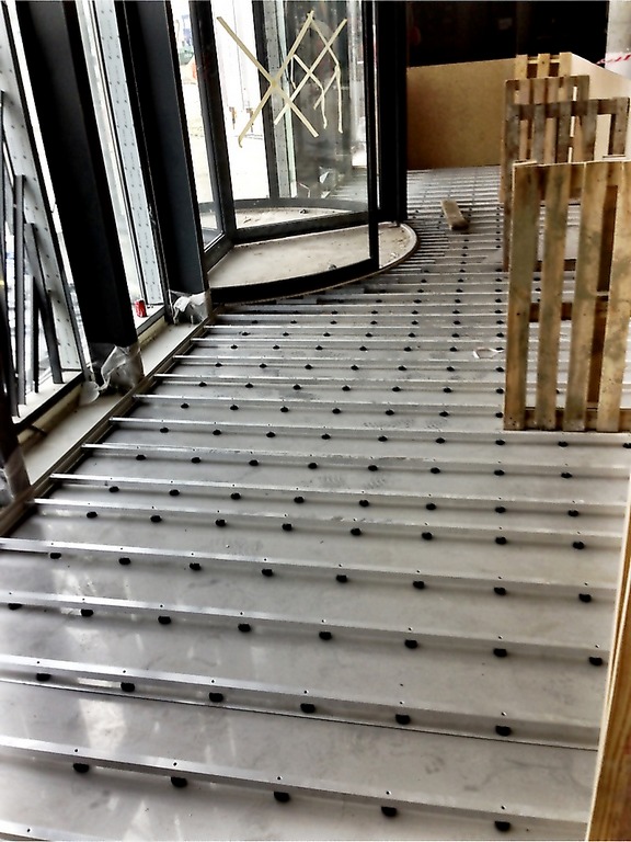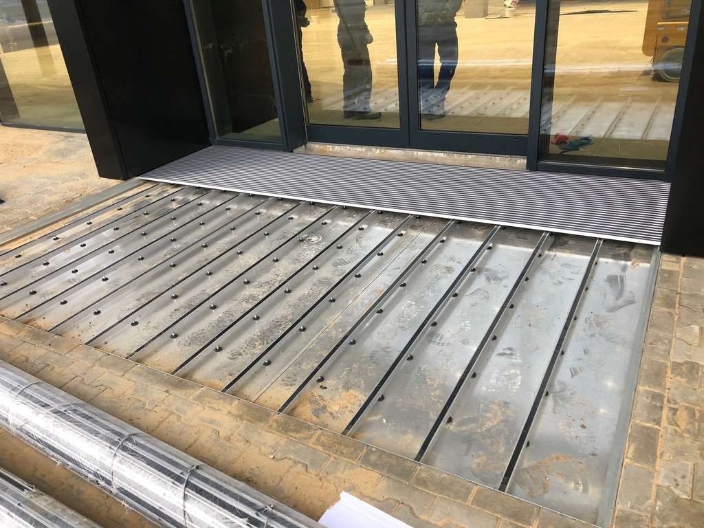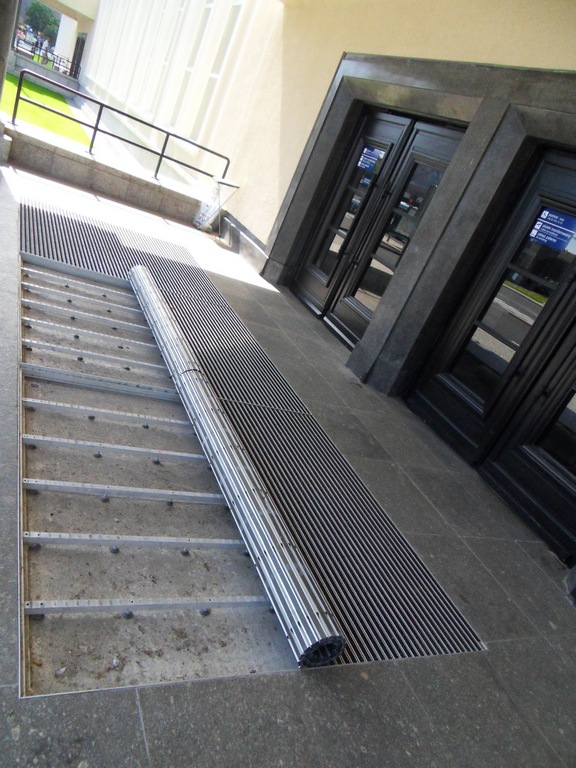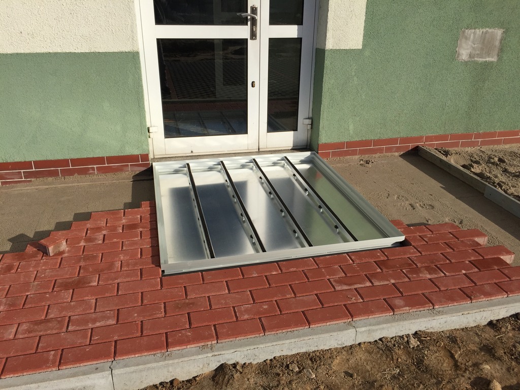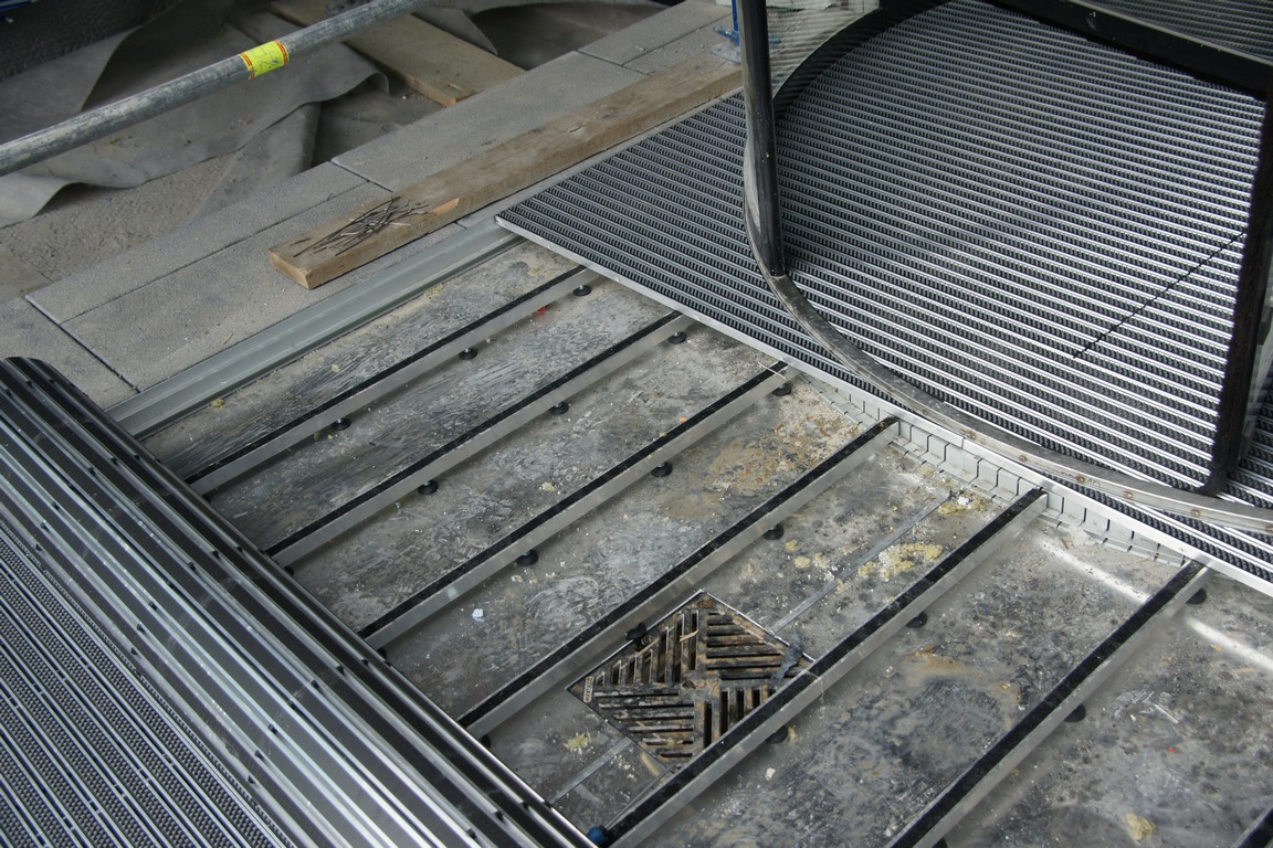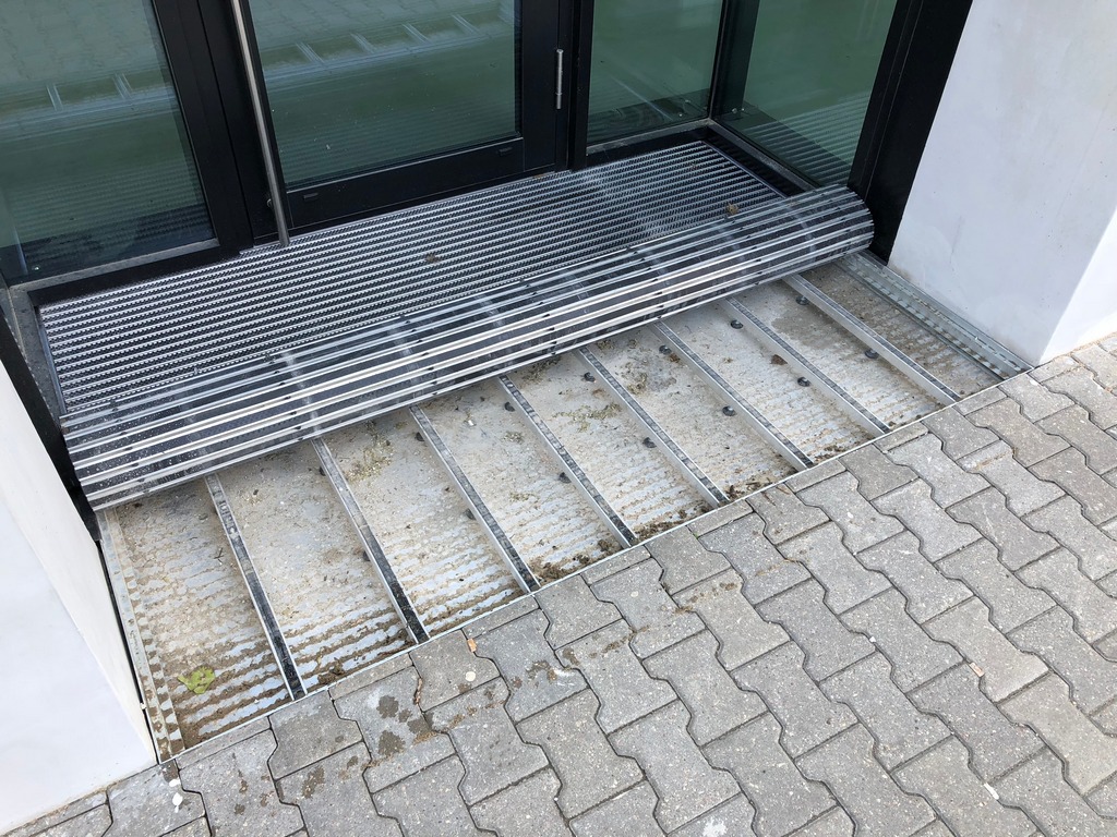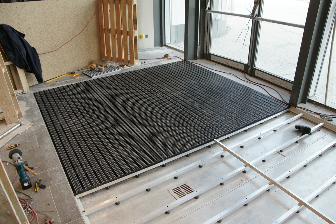 How it works? Professionally designed, anodized aluminum profiles create a frame with a bottom made of aluminium plate. Doormat supports are permamently mounted to the edges of the proflies, spaced approximately every 30 cm (made of square - shaped pipe 30x30x3). Those supporting elements have coasters that provide stability and possibility of leveling.