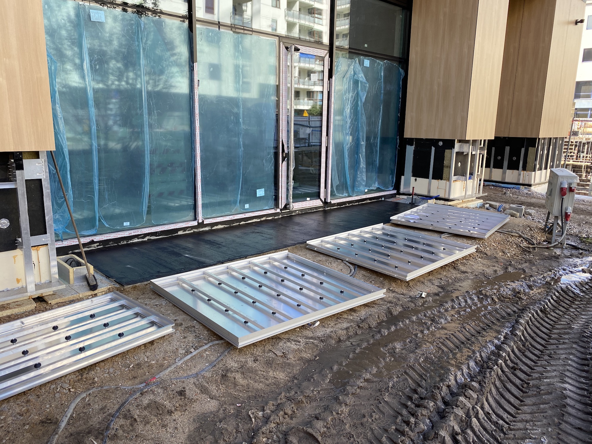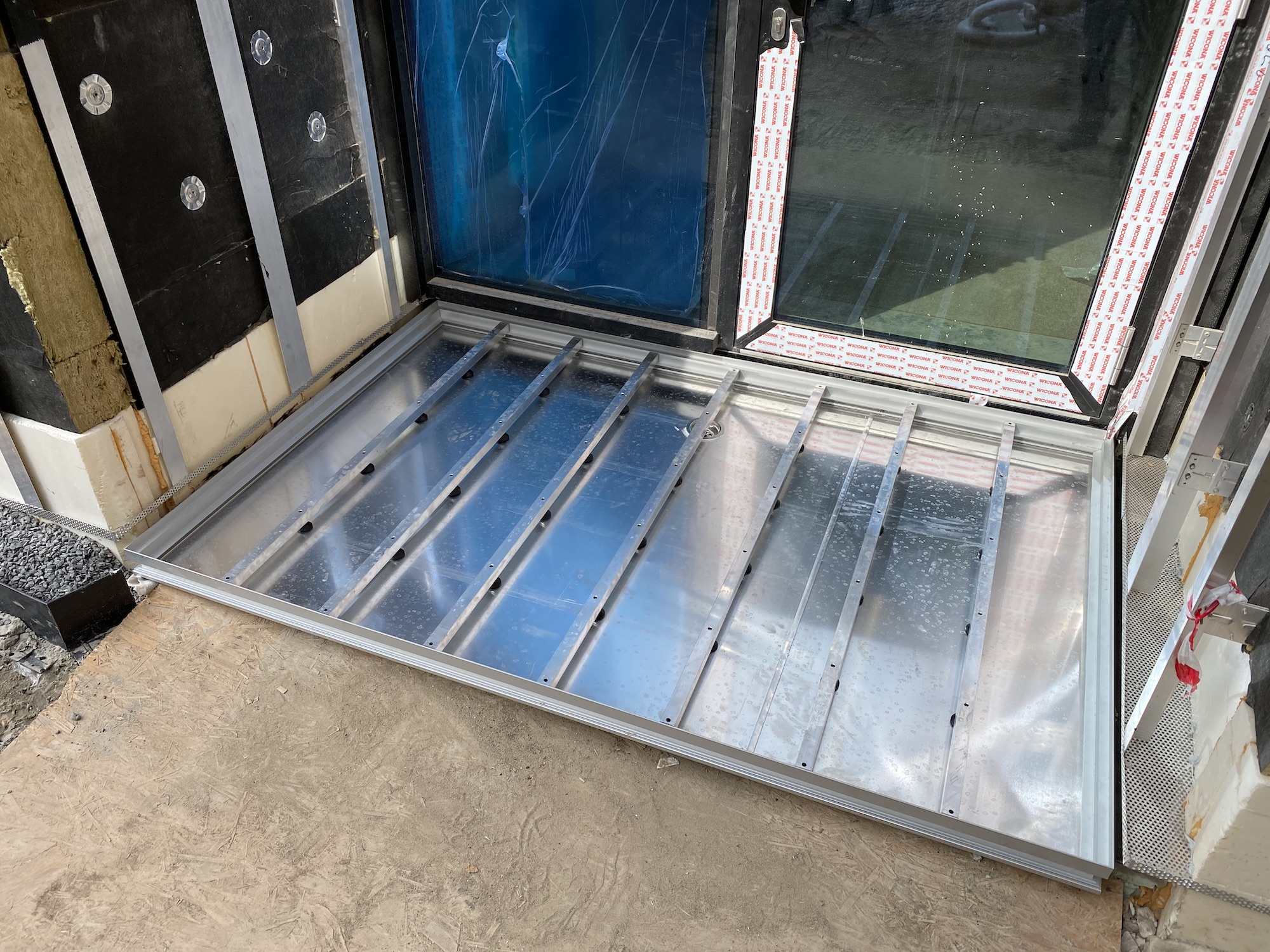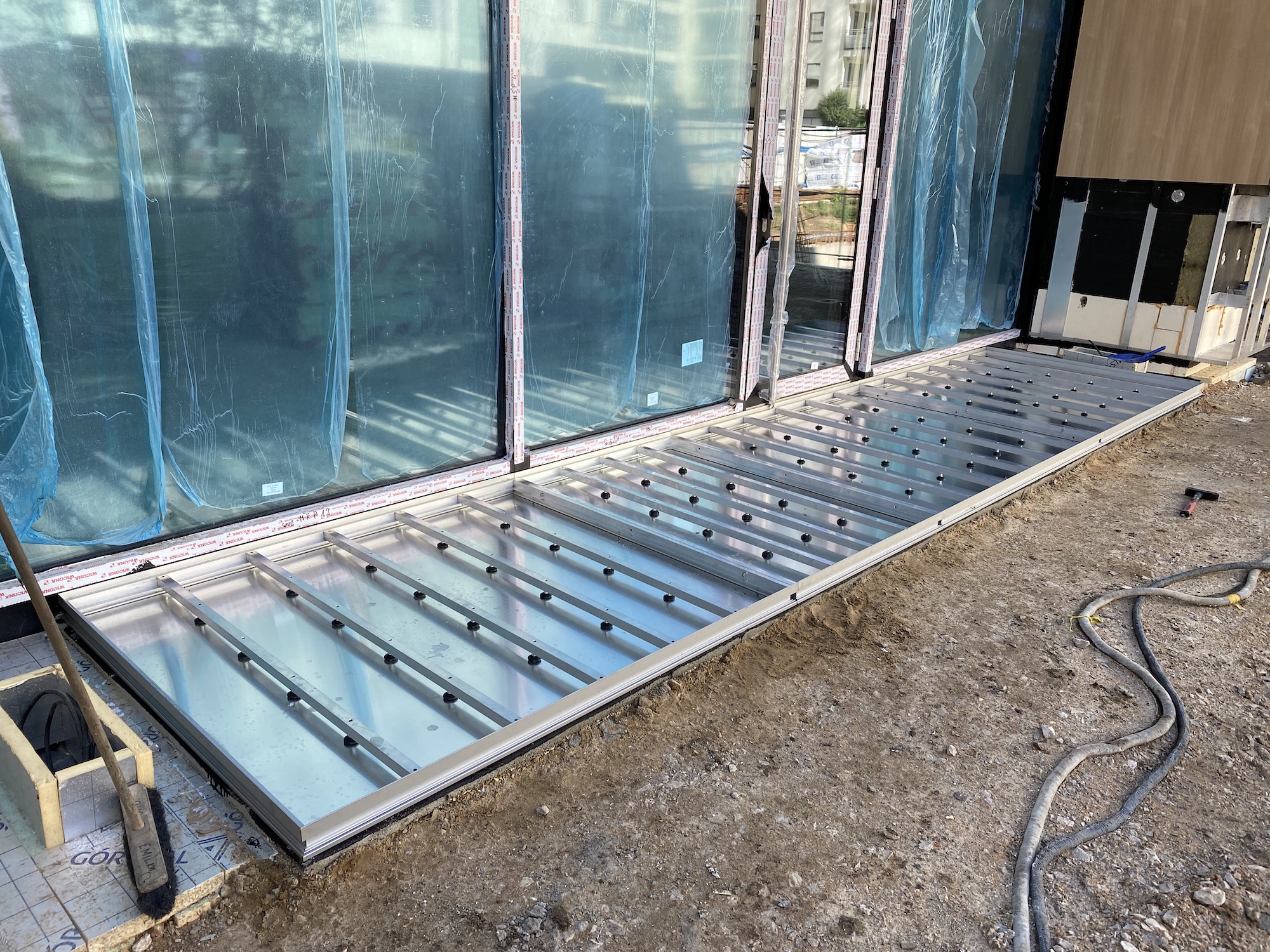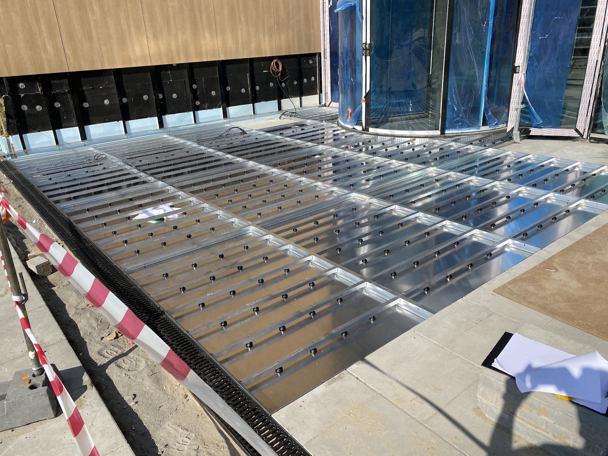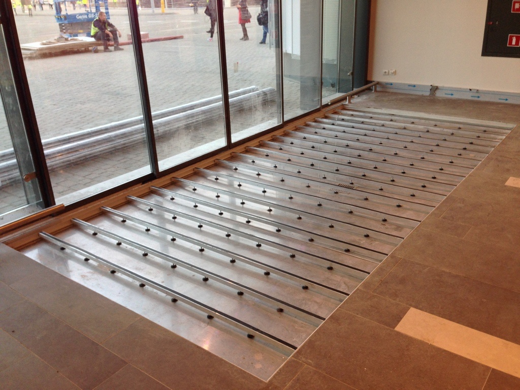 How it works? Professionally designed, anodized aluminum profiles create a frame with a bottom made of aluminium plate. Doormat supports are permamently mounted to the edges of the proflies, spaced approximately every 30 cm (made of square - shaped pipe 30x30x3). Those supporting elements have coasters that provide stability and possibility of leveling.